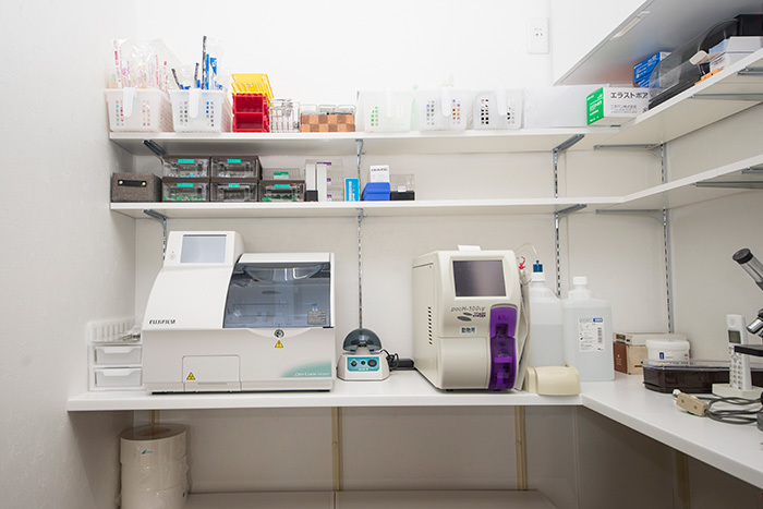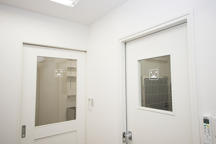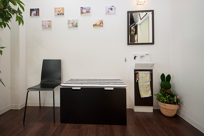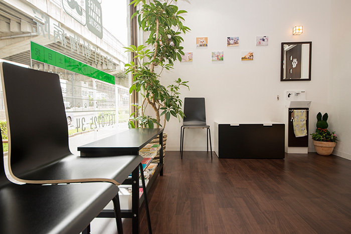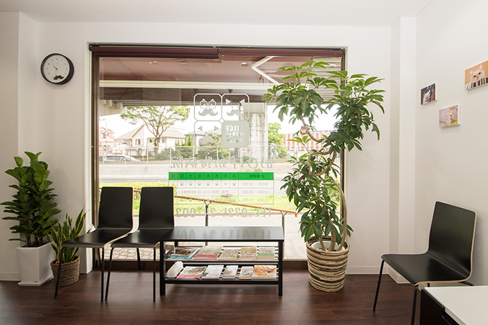 施設紹介 カートの乗ったわんちゃん、ねこちゃんが、そのまま院内に入れるようにスロープになっています。 強い日差しと雨を防げるよう、ロゴが入ったカフェ風の屋根があります。 お家に遊びに来たようにリラックスして頂きたいので、リビングのように落ち着ける、木目のフローリングにしました。 飼い主さまの隣に並んで座れるように、ベンチシートもあります(飛び降りないように気を付けてくださいね)。 太陽の光が差し込む明るく落ち着いた待合室で、本や雑誌を読んでお待ちください。 ドアベルや階段の手すり、受付など、ありとあらゆるところに、犬・猫・たまにおひげグッズが並んでいます。 撮影会イベントで雨樹一期さんが撮影した、かわいい犬猫の写真が飾っています。 待合室には小さな手洗い場もあります。わんちゃんにもお水をどうぞ。 各種、検査機器が取り揃えられています。 画像診断機器(エコー、レントゲン)。 および、麻酔・手術機器も揃っています。 わんちゃん・ねこちゃん、別の入院室で、それぞれゆったりと過ごしてもらえます。 お散歩や食事の際も、わんちゃんねこちゃんは顔を合わせない構造です。